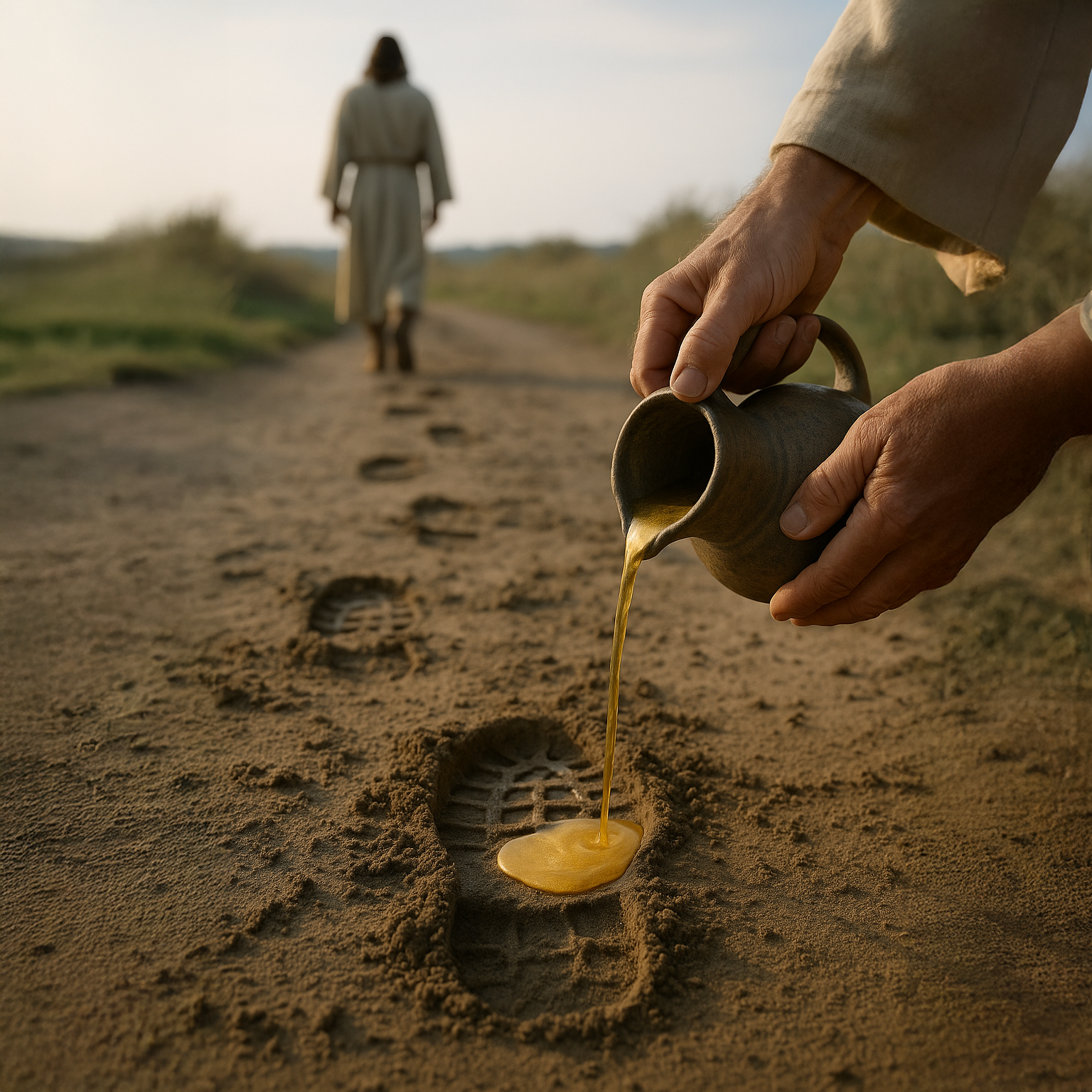 I saw a picture of someone walking from behind. Well defined footprints in the muddy ground. Father God is following closely behind, carefully tending to and preserving the footprints. Then, I see him pour liquid gold into them as a mold of each one. As they harden and set, one by one, he starts to collect in his hands, these round gold discs, each with a raised footprint in the centre. They are his treasures.
